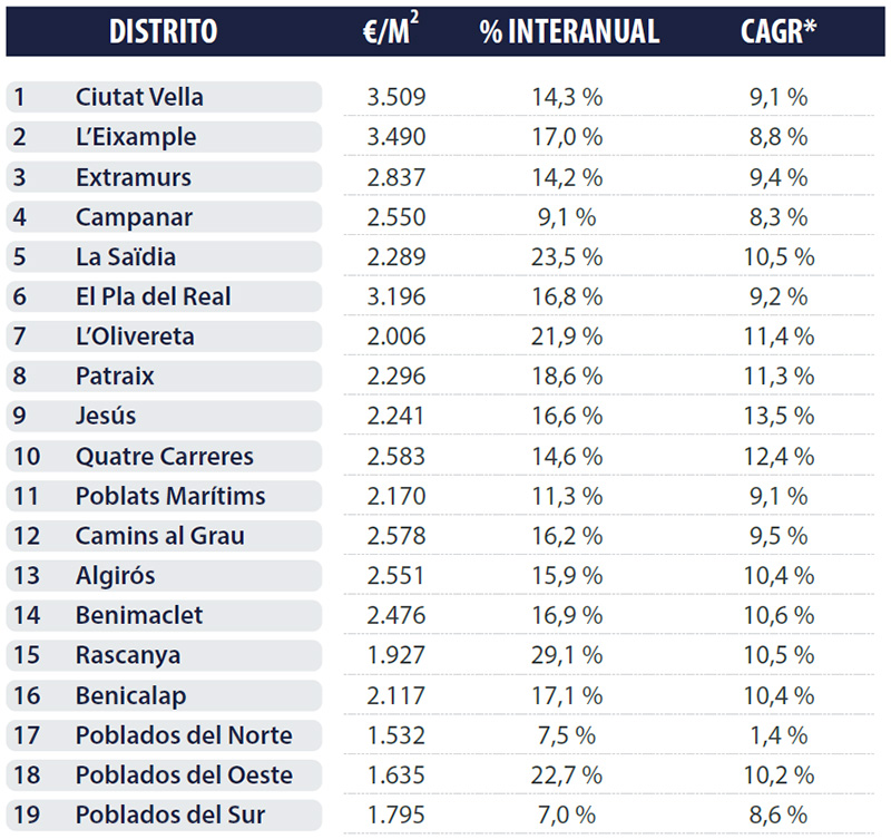 Both Valencia city and the province of Valencia are among the regions with a CAGR of over 9% (Valencia city even 10.9%), together with Málaga, Madrid and the Balearic Islands, among others. This means that property investors who entered Valencia five years ago have achieved very solid value growth on average.