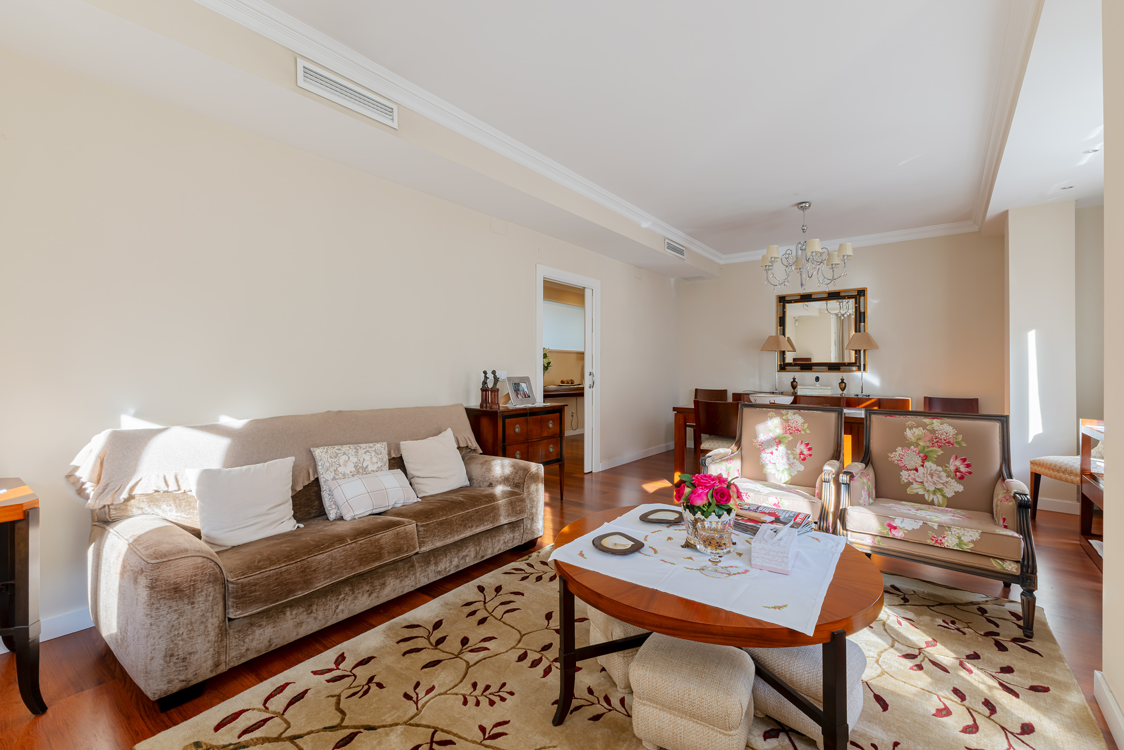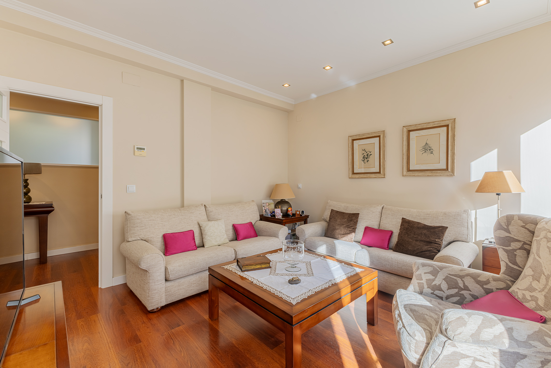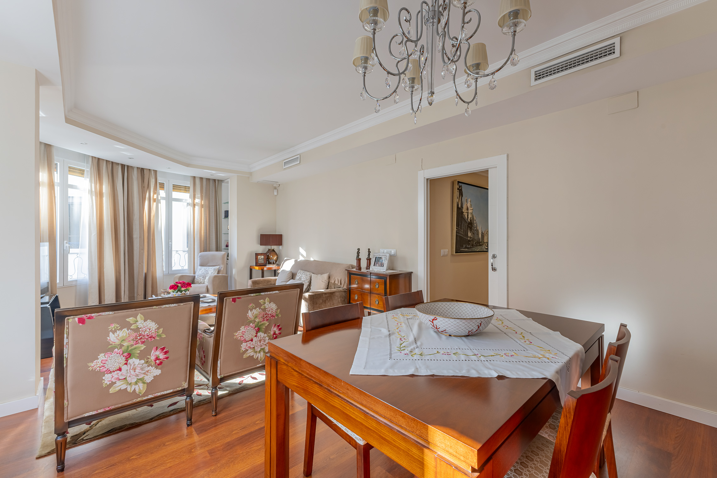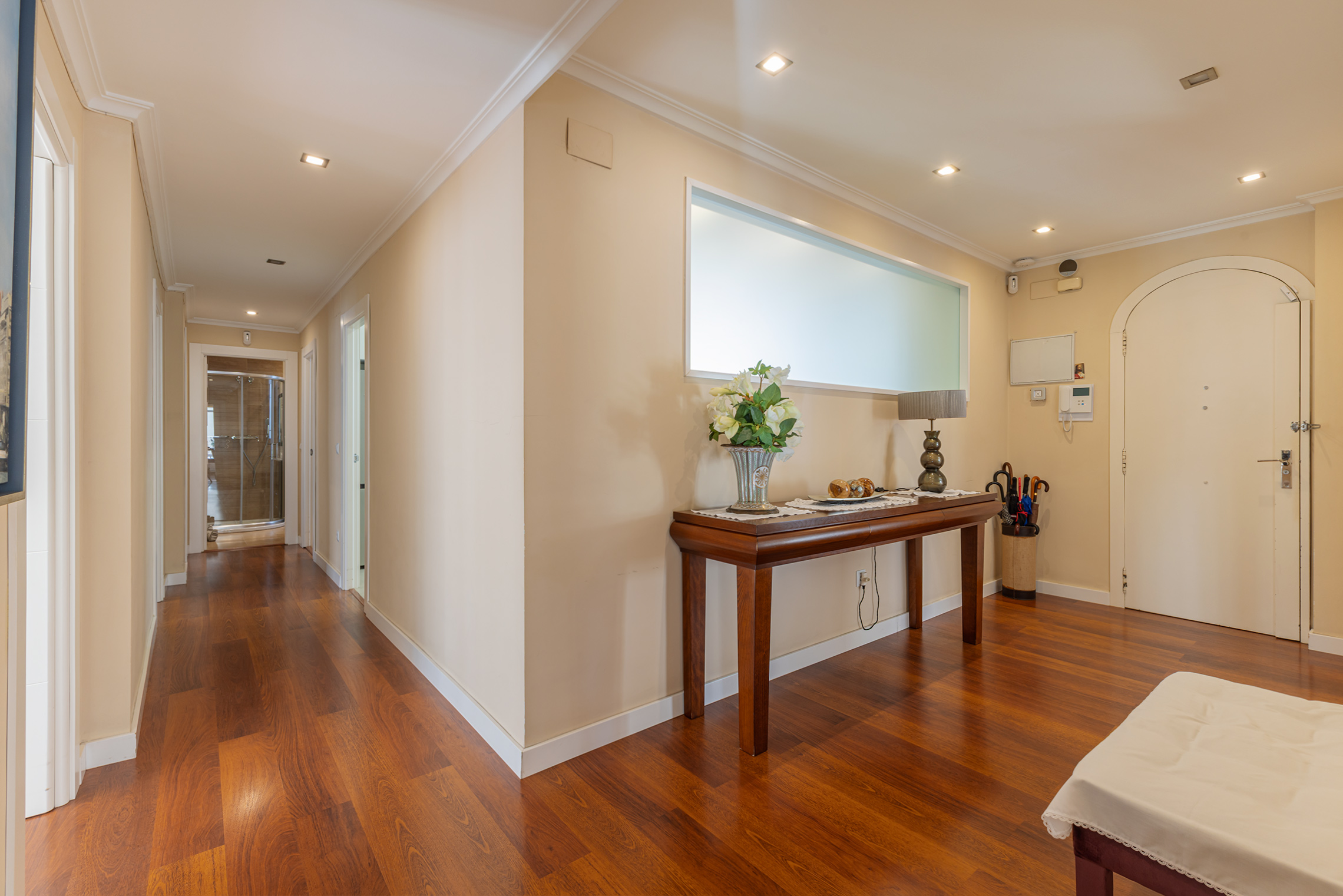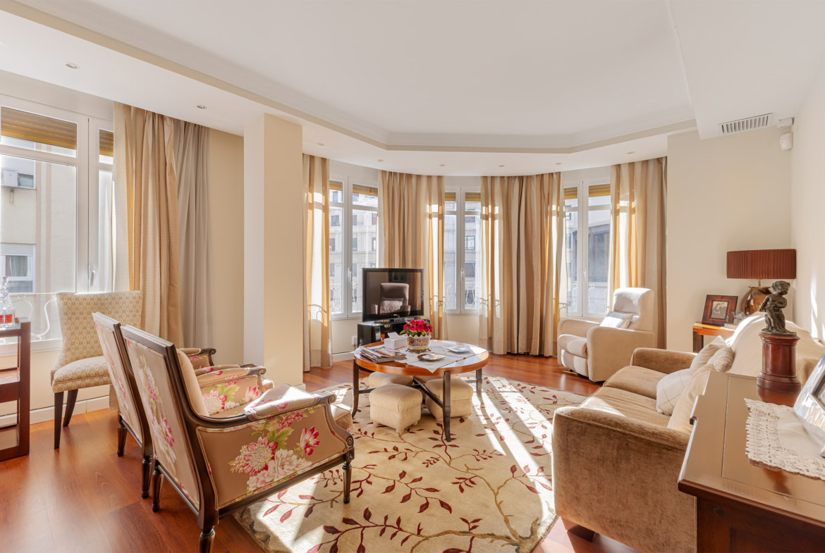 La propiedad destaca por su orientación exterior y la abundante luz natural en sus principales áreas de estar. Cuenta con una sala de estar y un comedor independientes, una cocina amplia y funcional, cuatro dormitorios y dos baños completos. Los espacios son cómodos y están bien proporcionados, adaptándose fácilmente a las necesidades de una familia. Fue completamente renovada en 2007, conservando un estilo atemporal que aún hoy resulta actual. El suelo de parqué aporta calidez, las paredes lisas amplían la sensación de espacio y las puertas pivotantes introducen un elemento distintivo con un sutil toque contemporáneo.