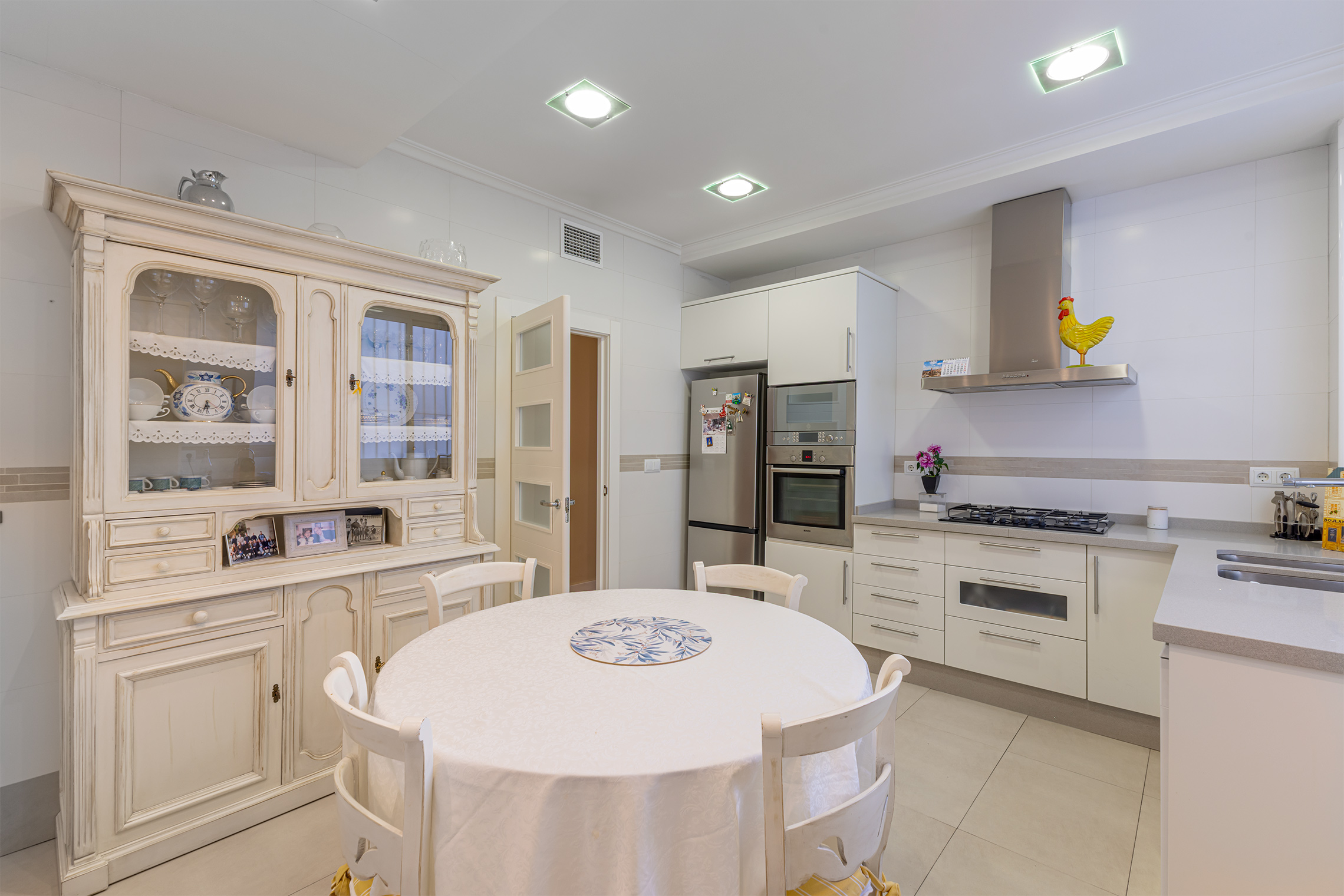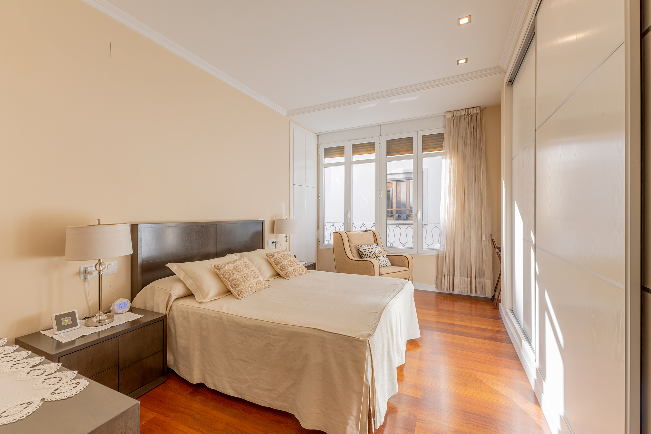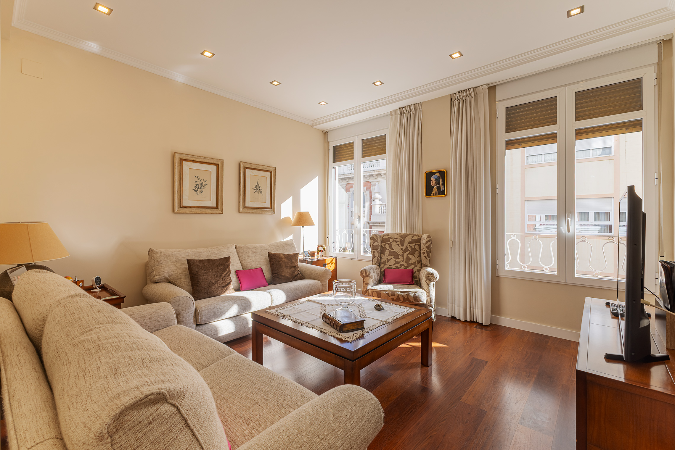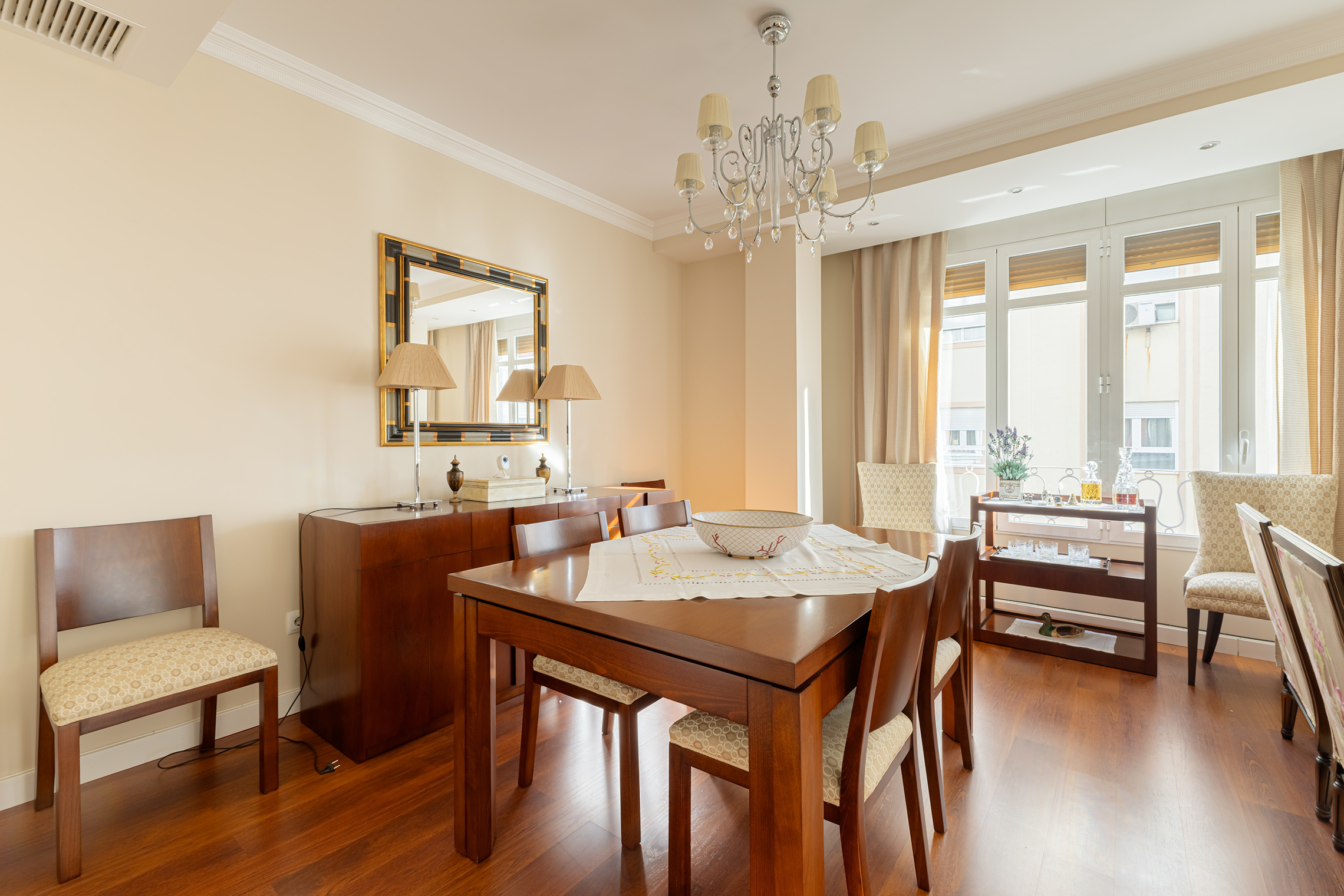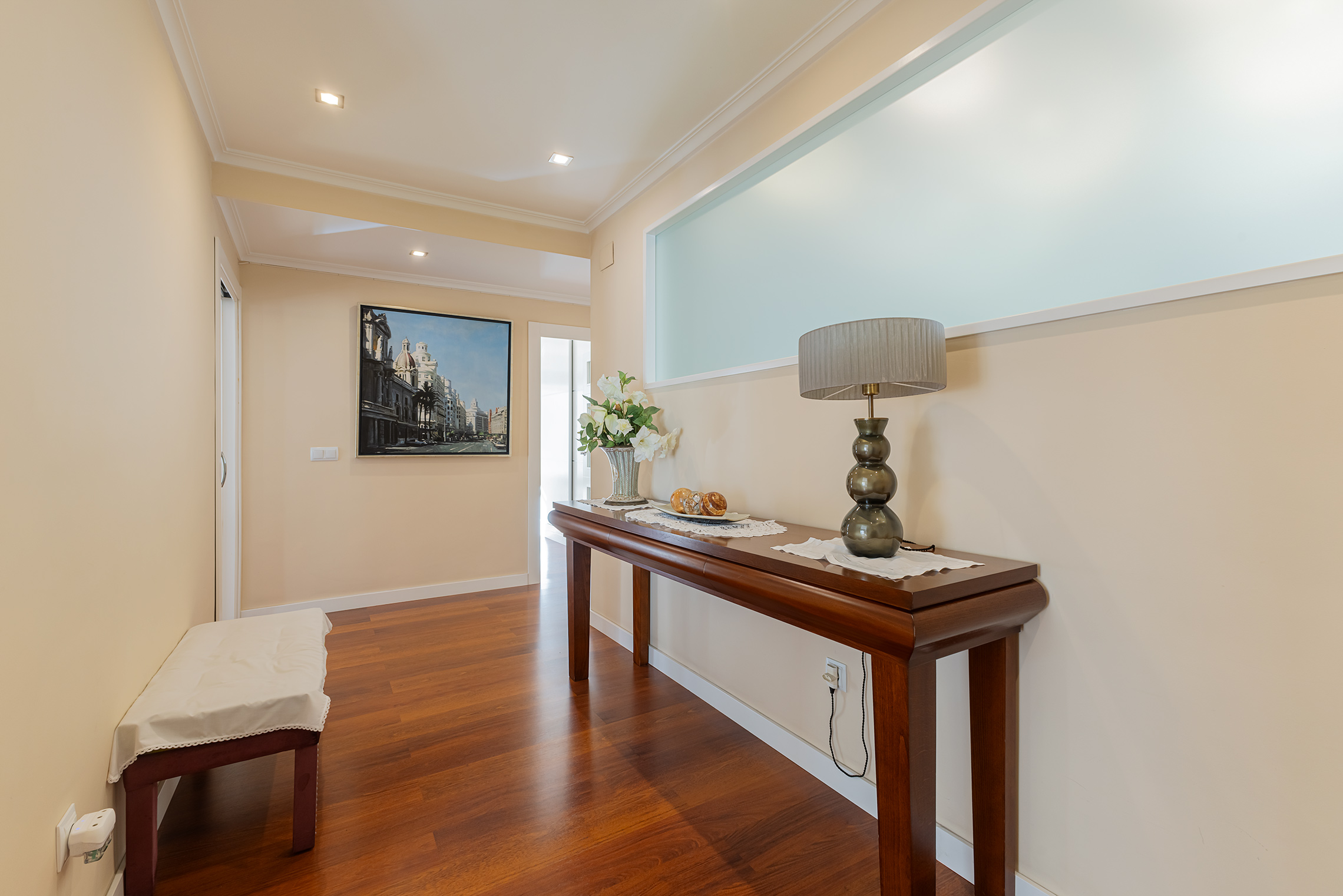 La propiedad destaca por su orientación exterior y la abundante luz natural en sus principales áreas de estar. Cuenta con una sala de estar y un comedor independientes, una cocina amplia y funcional, cuatro dormitorios y dos baños completos. Los espacios son cómodos y están bien proporcionados, adaptándose fácilmente a las necesidades de una familia. Fue completamente renovada en 2007, conservando un estilo atemporal que aún hoy resulta actual. El suelo de parqué aporta calidez, las paredes lisas amplían la sensación de espacio y las puertas pivotantes introducen un elemento distintivo con un sutil toque contemporáneo.