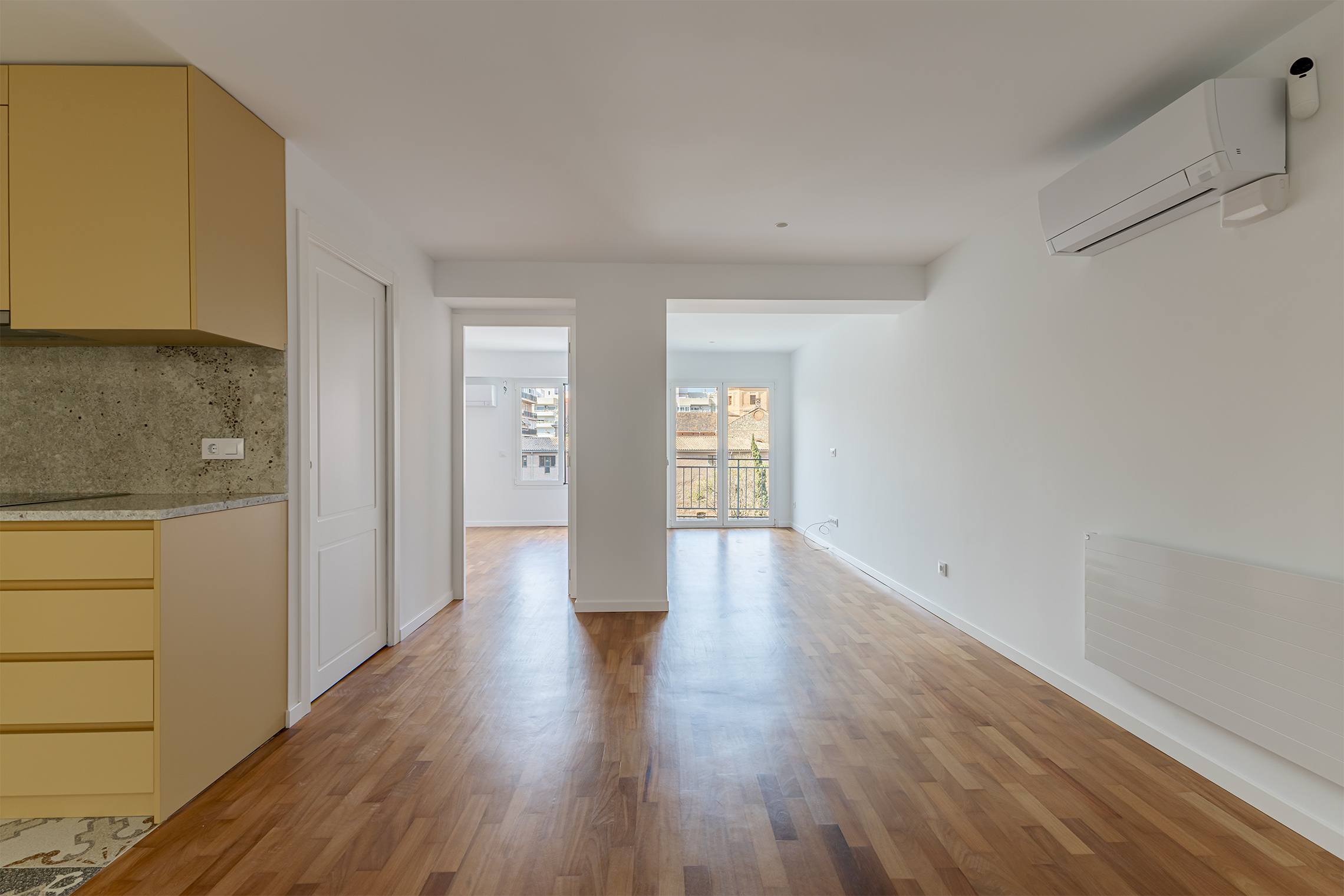 The apartment has a very compact layout, with no corridors or walkways, ensuring maximum use of space. The property opens onto a spacious open-plan area combining the kitchen and the living-dining room, from which there is access to a small terrace with unobstructed views. The property is completed by a separate utility room, a full bathroom and a good-sized bedroom.