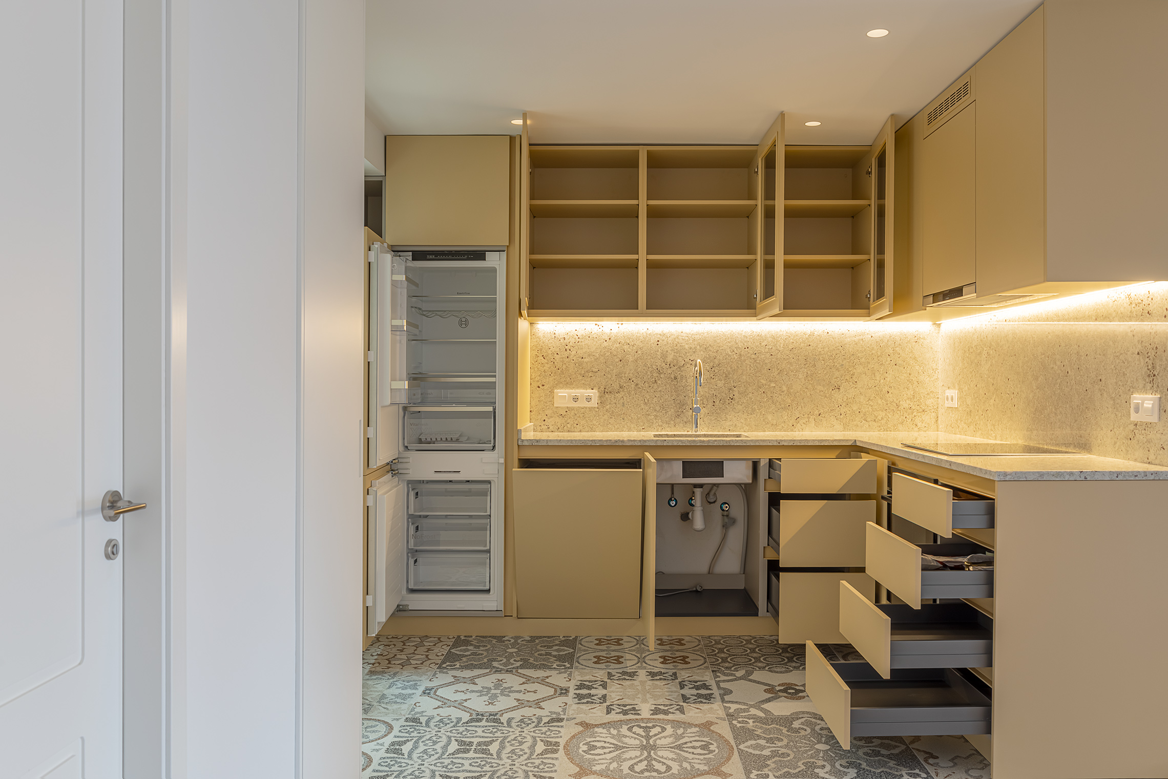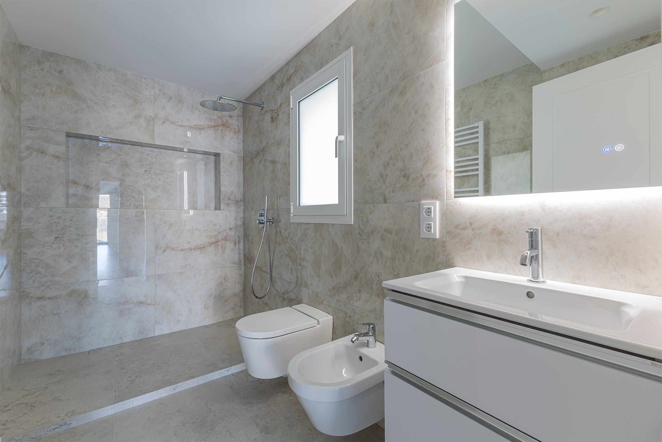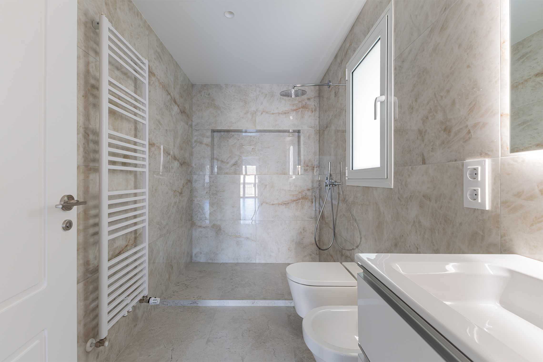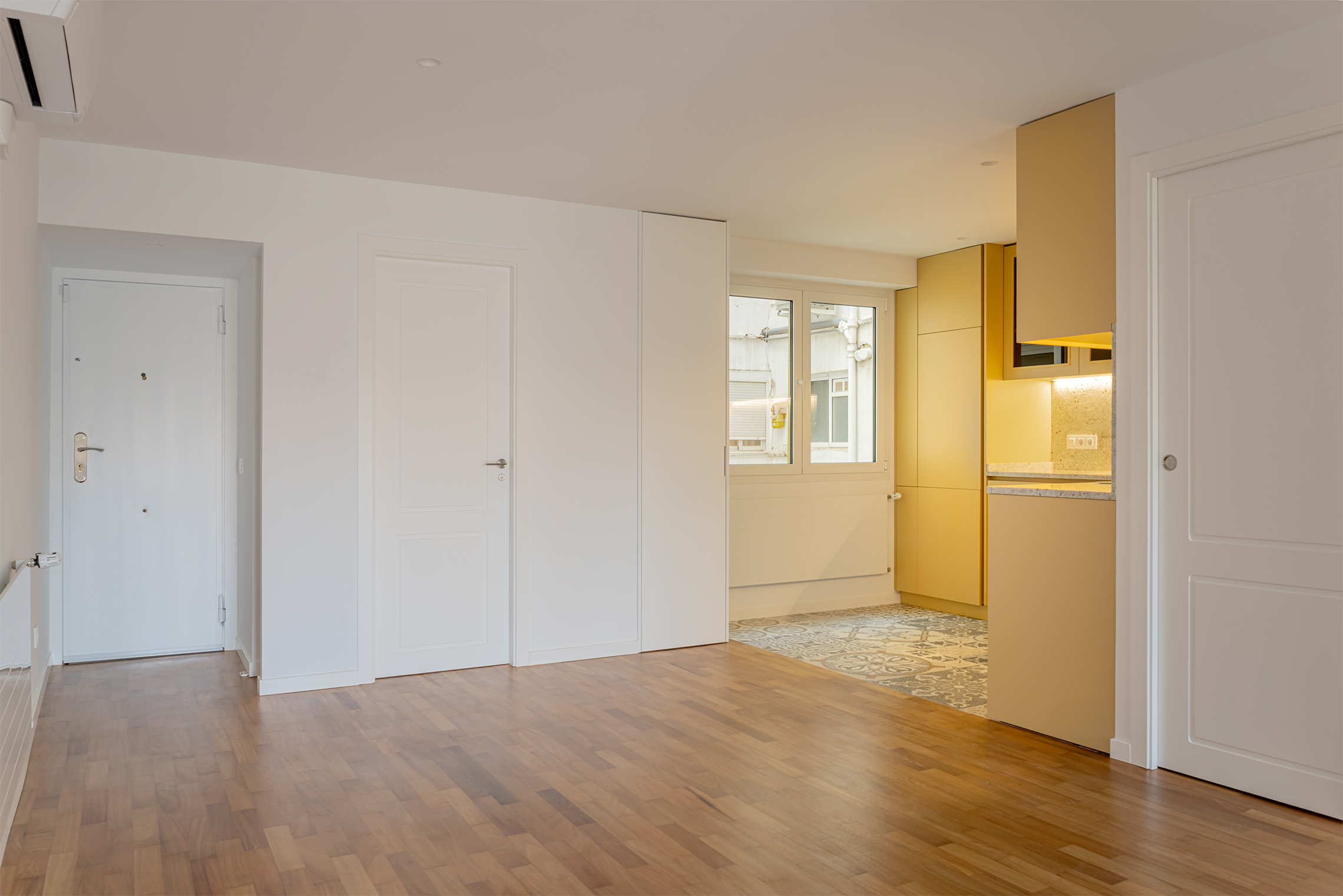 The property has undergone a brand-new, comprehensive refurbishment using high-quality materials. It features natural wood flooring, double-glazed windows and an exclusive matt white finish, smooth walls, bespoke wooden joinery, gas boiler heating and split-system air conditioning.