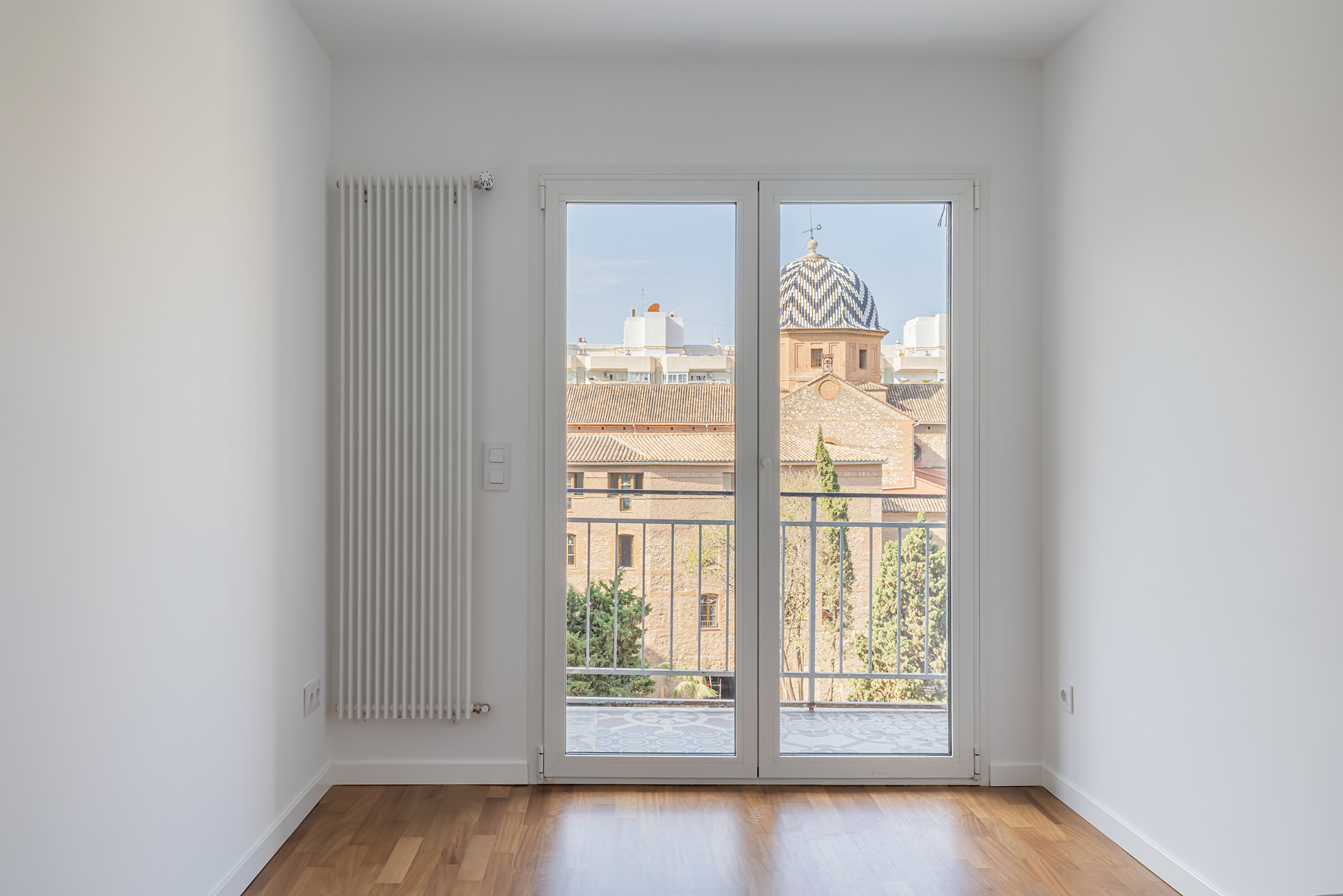Located in the Trinitat neighbourhood, just a few minutes’ walk from the Turia Gardens and the Viveros Gardens, this apartment has a floor area of 60 m², according to the land registry. The property is situated on the fourth floor of a building constructed in 1967, which has a lift and an entrance hall adapted for people with reduced mobility. The apartment faces the inner courtyard but stands out for its excellent natural light and pleasant views of the gardens of the Parish Church of Nuestra Señora del Carmen.