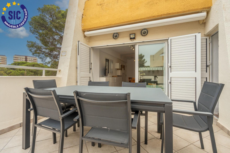 The bright living area connects seamlessly to a welcoming terrace shared with the kitchen — perfect for relaxing or enjoying meals outdoors. The property also includes air conditioning, a communal swimming pool, and a private parking space within the complex.