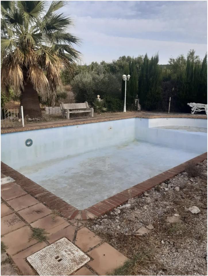 The estate includes a unique circular building (tower) spanning 3 floors with a surface area of 30 m². There are approximately 1,500 m² of pine trees and a large pool area of around 90,000 m³, complete with purifier, shower, and solarium. Adjacent to this is a bathroom, a traditional *paellero* (outdoor kitchen), and a barbecue area.