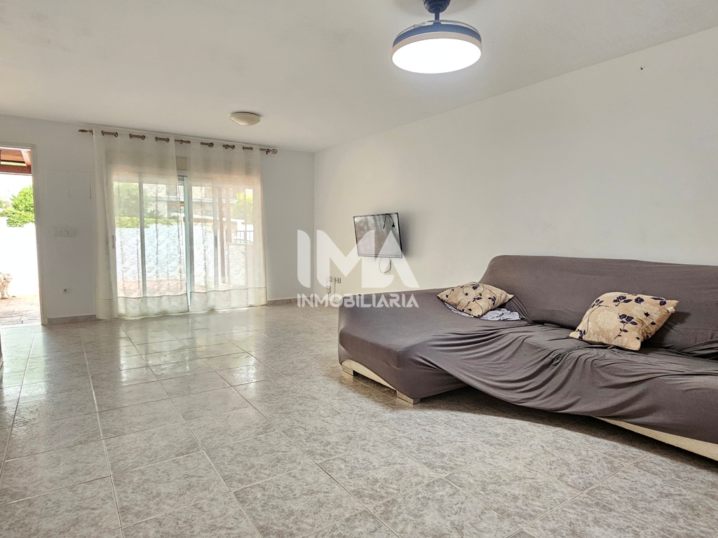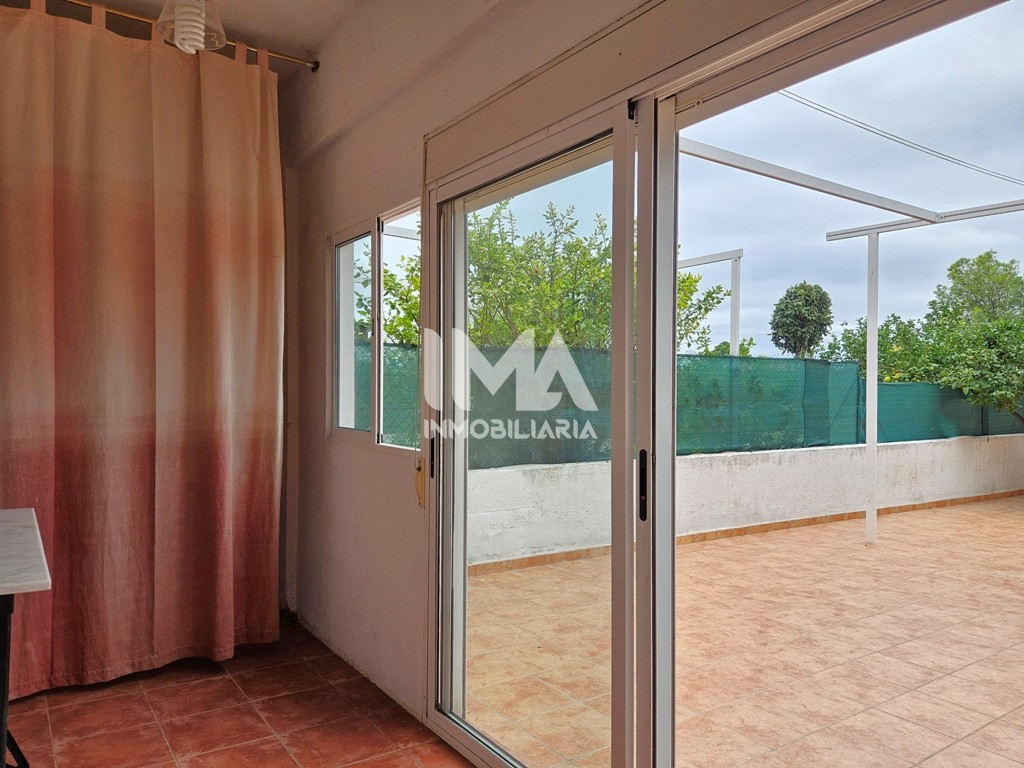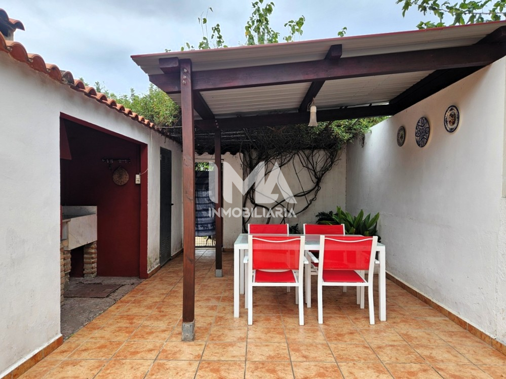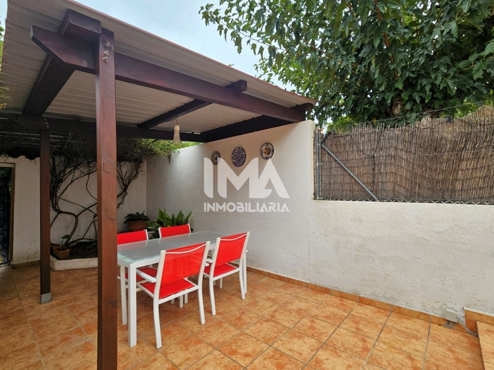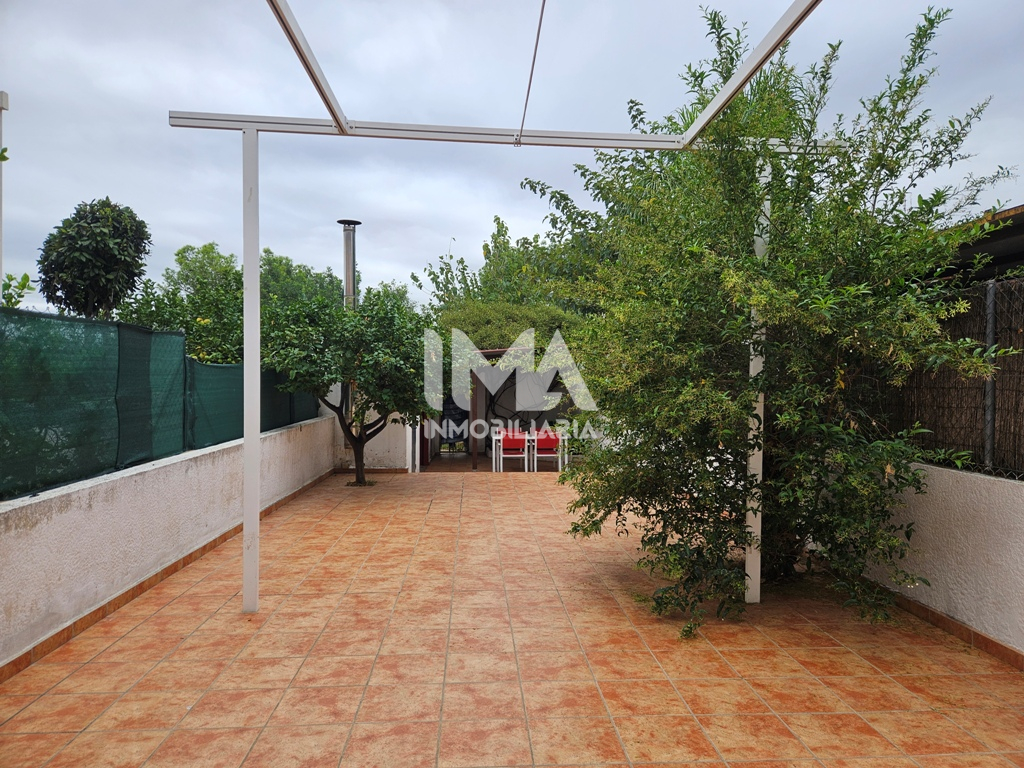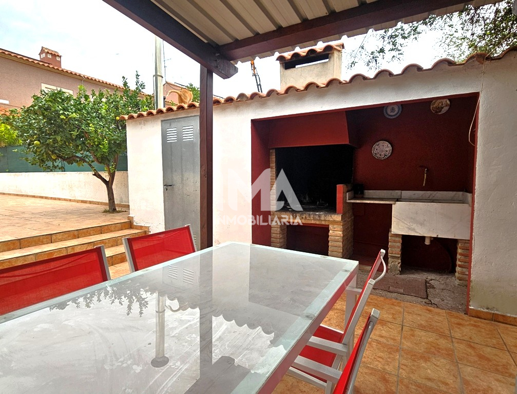 The back terrace offers a covered dining area (cenador), a paellero/barbecue, and a storage room. The garden is enhanced with a lemon tree and a night-blooming jasmine (galán de noche), adding natural fragrance and a true Mediterranean touch.