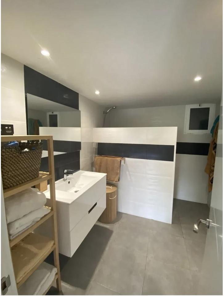The ground floor comprises two bedrooms, a bathroom, an open-plan living room and kitchen, and a spacious outdoor terrace. A striking 4-metre panoramic window provides stunning views over the pool and garden, flooding the interior with natural light.