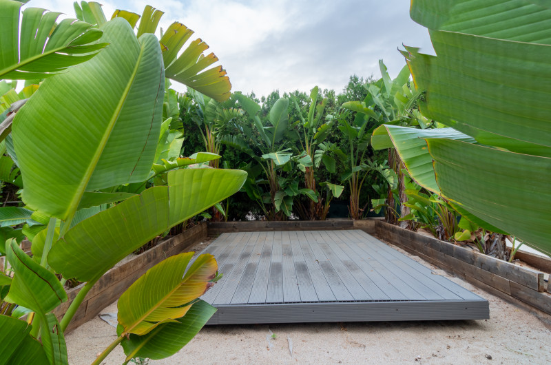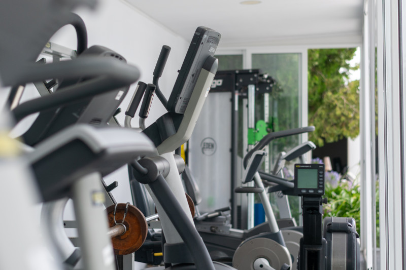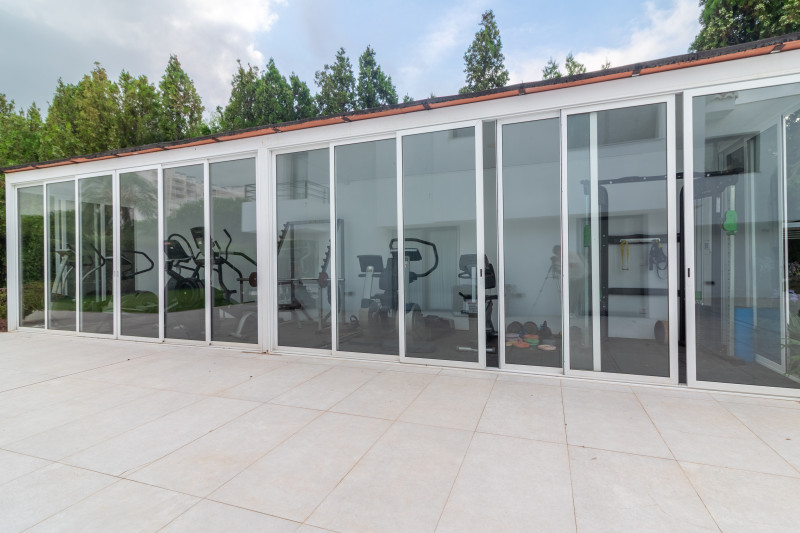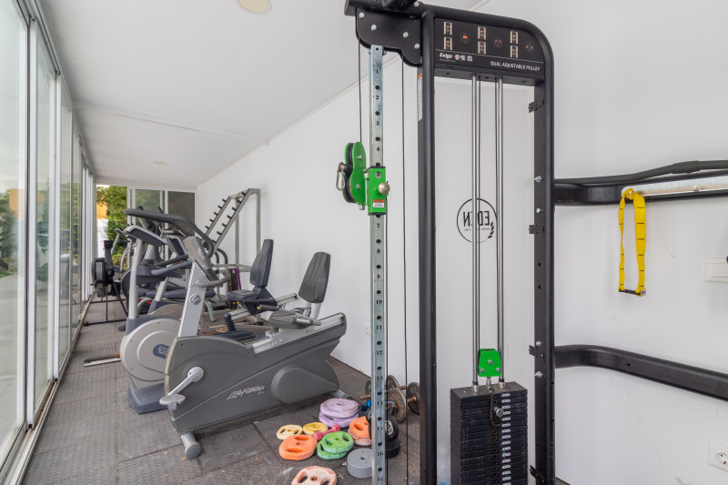 Outside, the property truly shines: a lush garden with mature trees, a covered outdoor gym, yoga terrace, treehouse, and a private swimming pool surrounded by sun terraces and greenery—perfect for entertaining and relaxation.