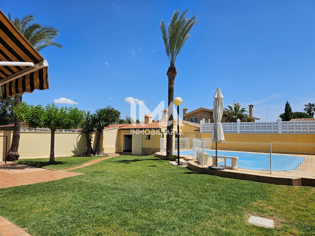 The exterior is one of the home’s highlights, featuring a beautiful swimming pool with Roman steps and a purification system, landscaped gardens, and a covered barbecue area (paellero) — perfect for gatherings and celebrations.