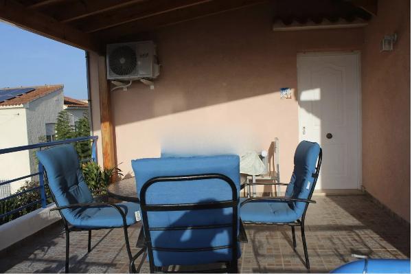 The ground floor offers 90 m² of living space, plus a covered terrace of 34 m². It features three spacious bedrooms, a shower room with toilet, a separate kitchen, and a living room equipped with a wood stove. Upstairs, there is a 70 m² apartment with a 20 m² terrace. This apartment includes two bedrooms with wardrobes, a shower room with toilet, a kitchenette, and air conditioning.