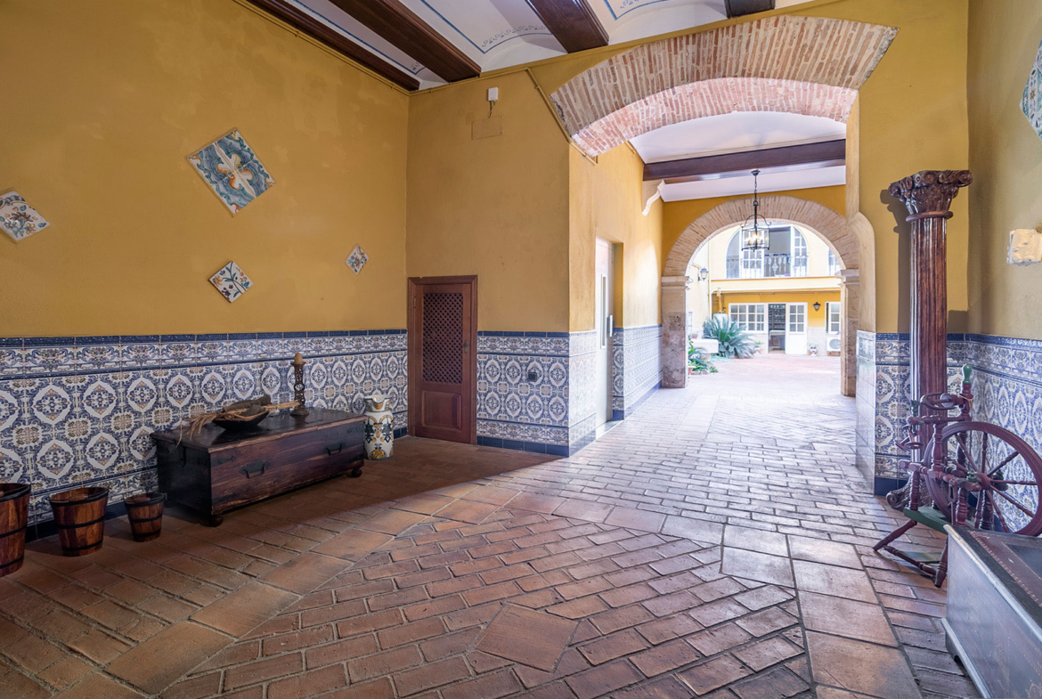 At the other end, we access the main house through a beautiful handmade Valencian tile staircase. From the imposing hall you can appreciate the magnitude of the original high ceilings with wooden beams, the nolla mosaic floors and the incredible restored wooden doors with stained glass and lintels of the time. This height houses a splendid dining room with three balconies facing the street, a very large fully equipped kitchen, a pleasant living room also with a balcony and a bathroom. From the kitchen there is access to a terrace that overlooks the central patio where the barbecue area is located, with a pantry and storage room, Jacuzzi and solarium.